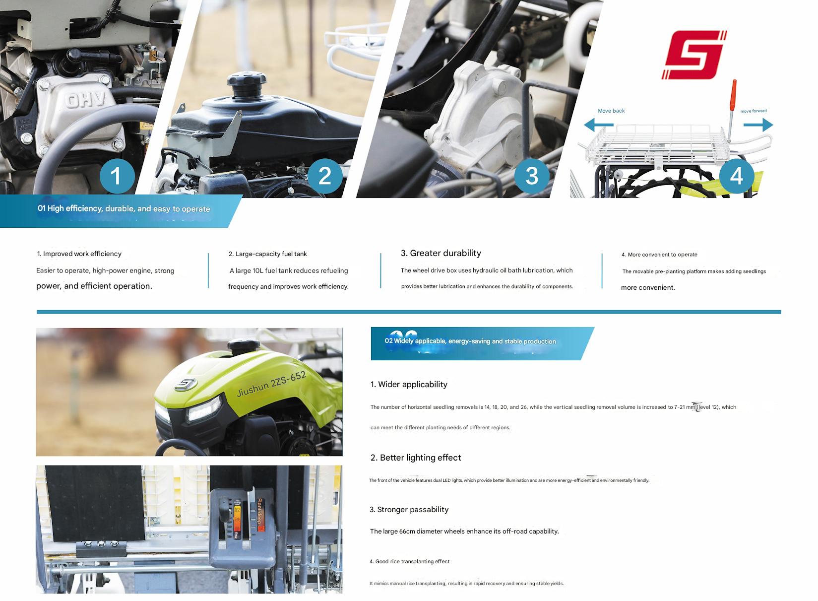 Today, Jiushun is a leading brand in China’s transplanter industry, offering four major product lines, including specialized machines for ratoon rice and dual-purpose transplanters for pot and mat seedlings. Powered by imported engines and featuring an innovative buffer contour chassis, our machines operate smoothly even in deep mud.